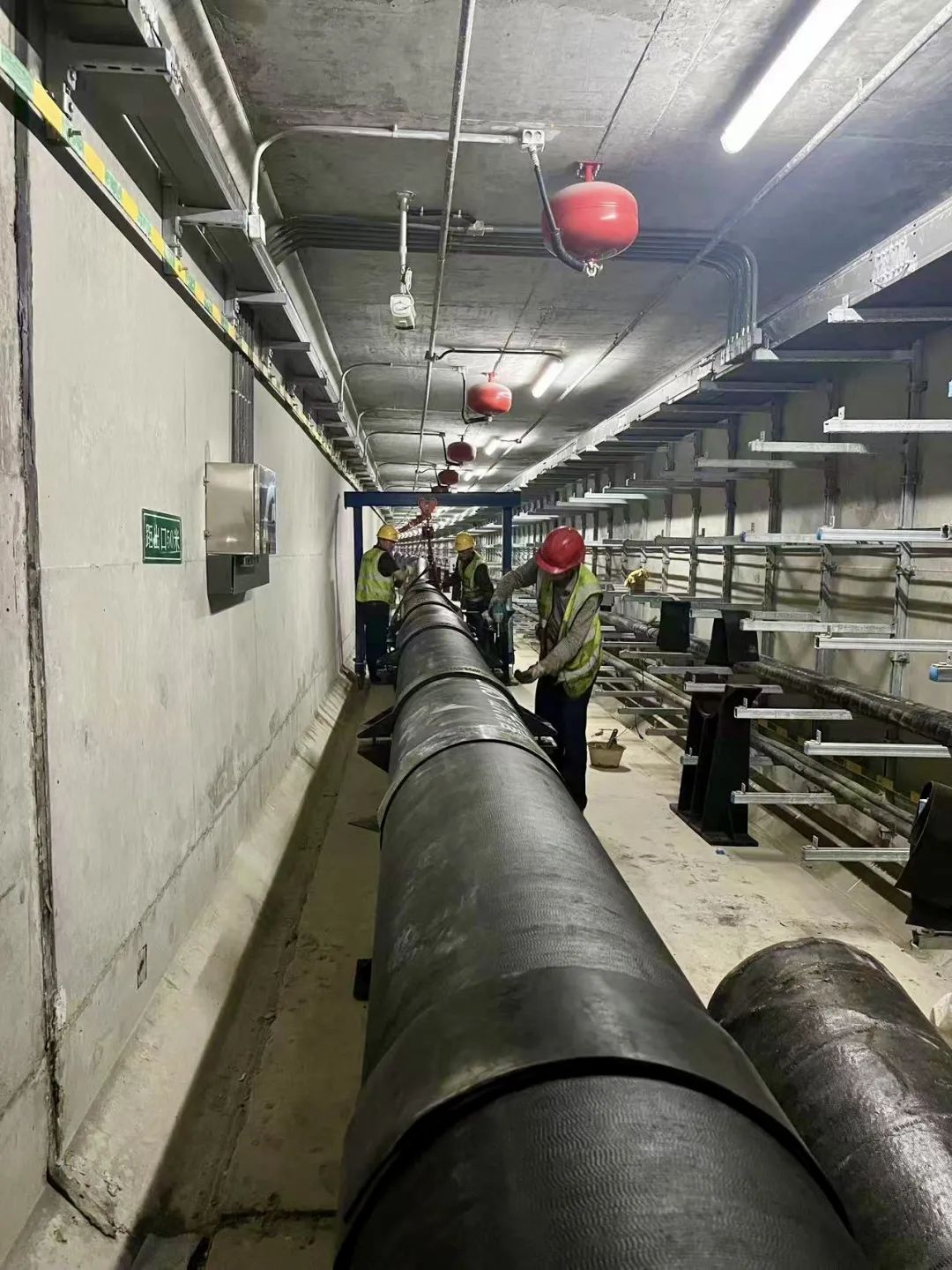 綜合管廊供水管網(wǎng)工程于今年3月份啟動(dòng),總投資700多萬(wàn)元,在管廊運(yùn)營(yíng)管理單位和相關(guān)部門的指導(dǎo)下,施工單位結(jié)合實(shí)際制定施工方案、創(chuàng)新施工方法,專門定做適合地下管廊作業(yè)使用的小型龍門吊和水平運(yùn)輸工具,同時(shí)上足人力,確保材料轉(zhuǎn)運(yùn)入廊不受影響,從而克服了作業(yè)空間狹窄、材料轉(zhuǎn)運(yùn)吊裝等困難,確保了項(xiàng)目安全、有序完成。進(jìn)入管廊可以看到,一條直徑DN400的球墨鑄鐵管道被穩(wěn)穩(wěn)安裝固定在管廊底部基座上,管道兩端將分別與迎賓大道、編鐘大道供水主管網(wǎng)連通,管道通水后城南片區(qū)供水將形成環(huán)狀管網(wǎng),可有效緩解片區(qū)供水壓力不均衡的現(xiàn)狀,將為城南片區(qū)供水服務(wù)及后期開(kāi)發(fā)建設(shè)提供堅(jiān)實(shí)保障。