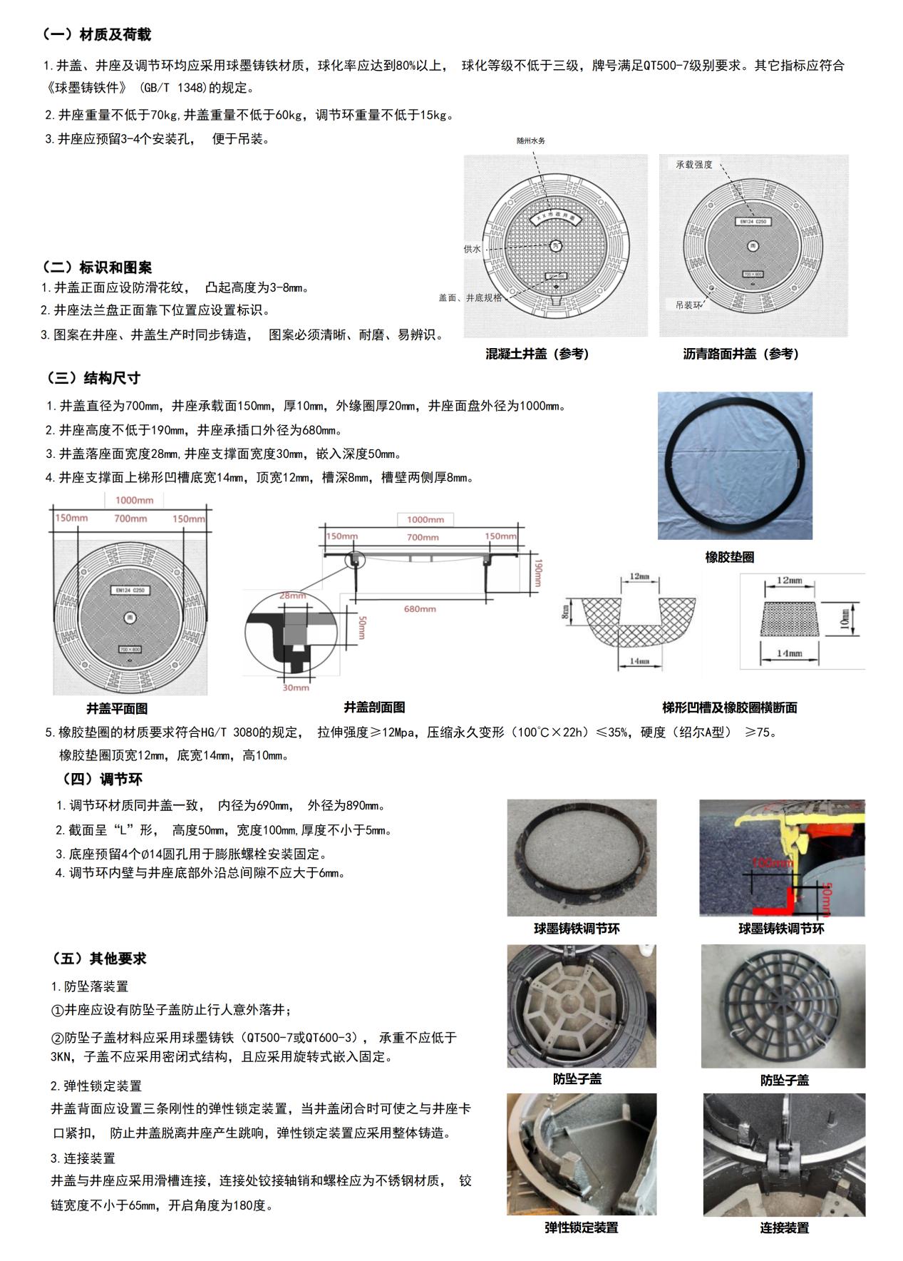 2、井蓋正面應設防滑花紋,凸起高度為3-8mm;井座應設有防墜子蓋防止行人意外落井防墜子蓋材料應采用球墨鑄鐵(QT500-7或QT600-3),承重不應低于3KN,子蓋不應采用密閉式結構,且應采用旋轉式嵌入固定。井座重量不低于70kg,井蓋重量不低于60kg,調節(jié)環(huán)重量不低于15kg(具體規(guī)格型號參照附件5);