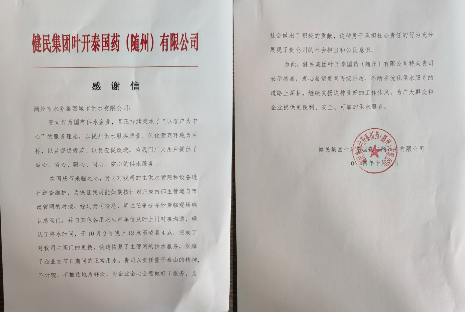 “排憂解難及時 供水服務周到”,近日,健民集團葉開泰國藥(隨州)有限公司專程到隨州市水務集團下屬子公司城市供水有限公司送上一面承載誠摯謝意的錦旗和一封感謝信,他們用最質樸、最真摯的方式,對公司運維人員熱情、高效、便捷、暖心的服務表示誠摯感謝。