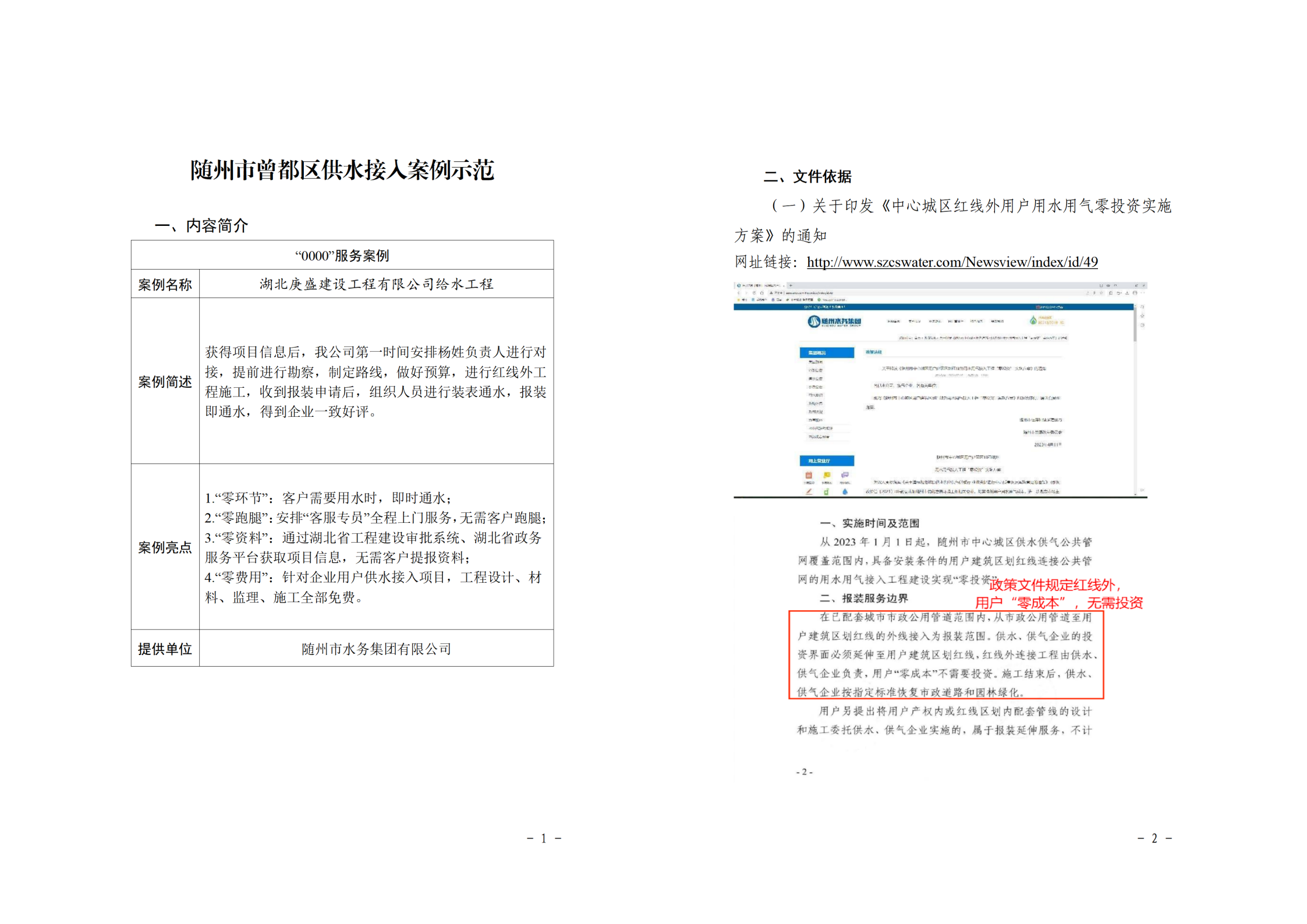 隨州市水務(wù)集團(tuán)主要職責(zé)是向隨州市中心城區(qū)、曾都區(qū)、隨縣以及高新區(qū)提供供水服務(wù),集團(tuán)公司下轄城市供水公司、建設(shè)工程公司、水質(zhì)檢測公司、隨縣供水公司、康潤實業(yè)公司5家全資子公司。下面展示隨州市曾都區(qū)供水接入案例示范。
