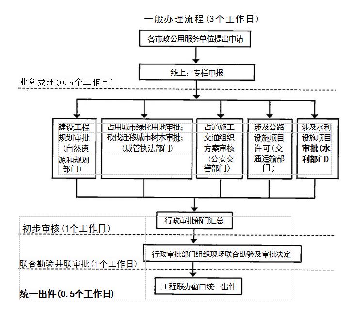 并聯(lián)審批辦理總時限:告知承諾制項目無需批前審批,由城 管、交通、公安審批部門加強(qiáng)現(xiàn)場實(shí)施監(jiān)管;一般審批項目3個 工作日(不含方案和評價報告編制時間、方案評審時間、申請人修改、審批前公示或公證時間)。